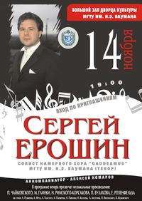 В Большом зале Дома культуры МГТУ им.Н.Э.Баумана состояля концерт Сергея Ерошина - солиста камерного хора "Гаудеамус" (аккомпаниатор - Алексей Комаров). В концерте прозвучали произведения П.Чайковского, М.Глинки, Н.Римского-Корсакова, П.Булахова Е.Розенфельда и др.