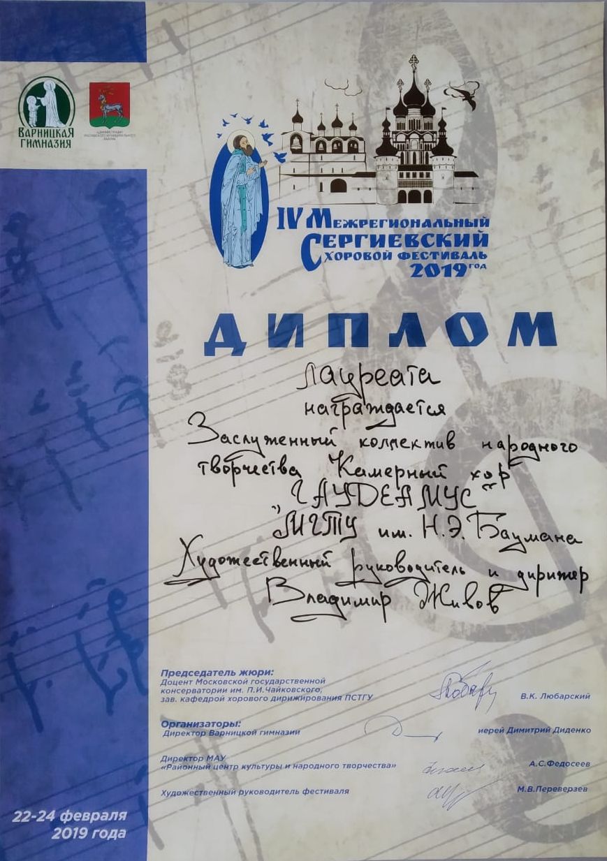профессора Живова Владимира Леонидовича - заслуженного деятеля искусств России, к.пед.н., профессора Московского государственного педагогического университета, председатель комиссии академических хоров Московского музыкального общества, художественный руководитель студенческого камерного хора «Гаудеамус» МГТУ им. Н.Э.Баумана.